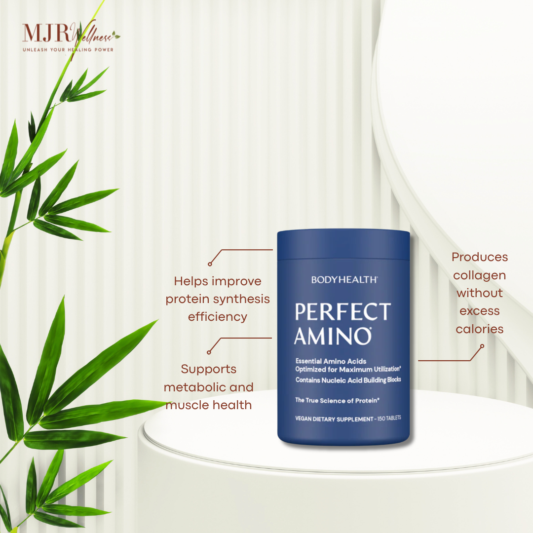 PerfectAmino delivers a precise ratio of essential amino acids that the body needs to build new protein, muscle, and collagen. Because this blend is formulated for optimal utilization — up to ~99% — it supports efficient protein synthesis with minimal caloric impact, making it suitable even during fasting or calorie-restricted periods.*